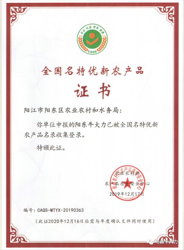 經(jīng)農(nóng)業(yè)農(nóng)村部農(nóng)產(chǎn)品質(zhì)量安全中心組織專家技術(shù)評審確認,并在中國農(nóng)產(chǎn)品質(zhì)量安全網(wǎng)公示,陽江市陽東區(qū)農(nóng)業(yè)農(nóng)村和水務(wù)局申請、主要生產(chǎn)經(jīng)營單位-廣東粵森生態(tài)農(nóng)業(yè)科技有限公司的“陽東牛大力”正式納入全國名特優(yōu)新農(nóng)產(chǎn)品名錄,并核發(fā)全國名特優(yōu)新農(nóng)產(chǎn)品證書。